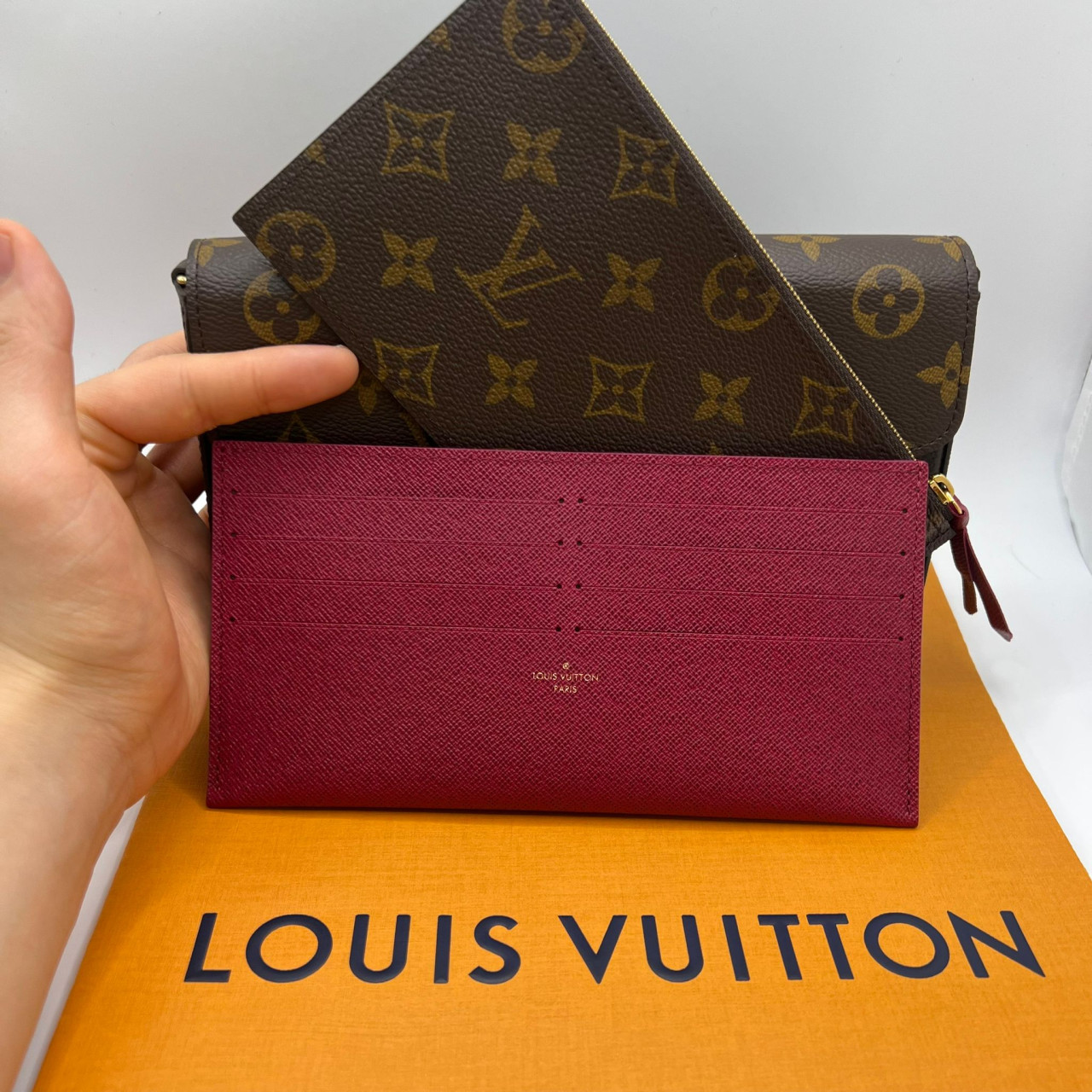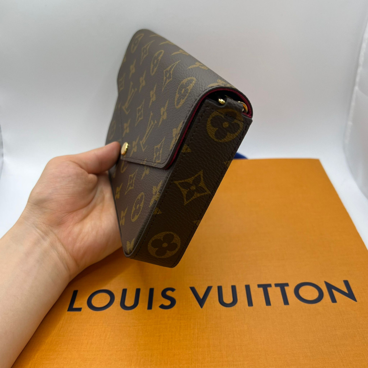 활용도가 높은 Félicie Pochette 플랩 파우치는 모노그램 캔버스로 제작되었으며 푸크시아 극세사로 안감 처리되어 있습니다.